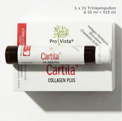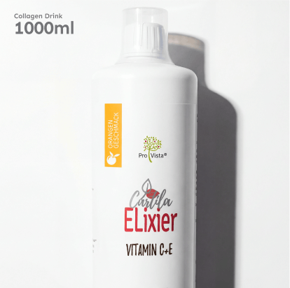 Unser Cartila® Elixier liefert mit einer Portion 10g Kollagen-Hydrolysat. Durch die Ergänzung von Vitamin C kann Cartila® Elixier zur Kollagenbildung beitragen. Auch Vitamin E bringt positive Eigenschaften mit sich und schützt die Zellen vor oxidativem Stress. Beide decken mit 125% Vitamin C und 208 % Vitamin E den täglichen Bedarf mit nur einer 25 ml Portion
